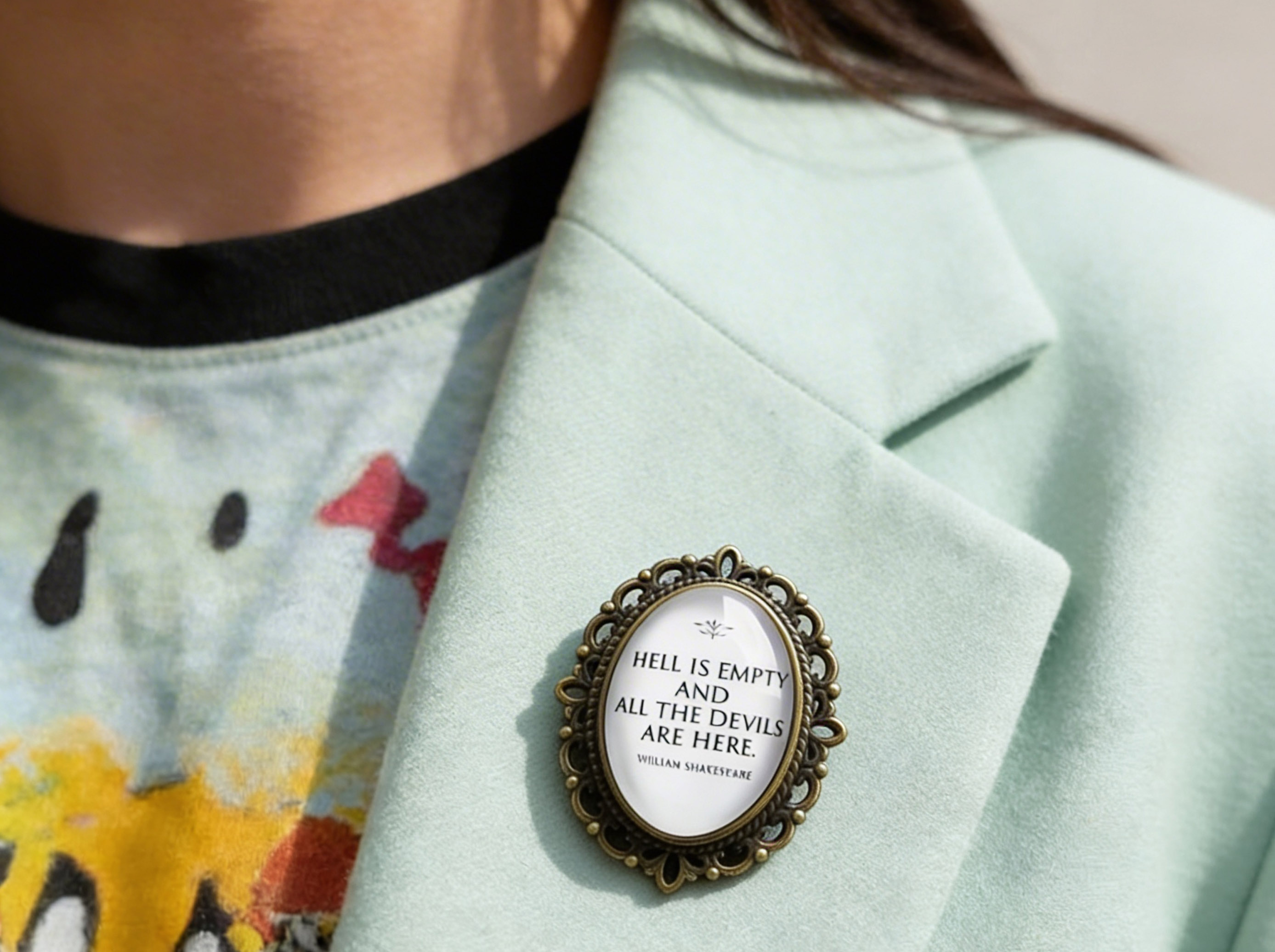 Очень красивая миниатюрная брошь c цитатой Уильяма Шекспира.