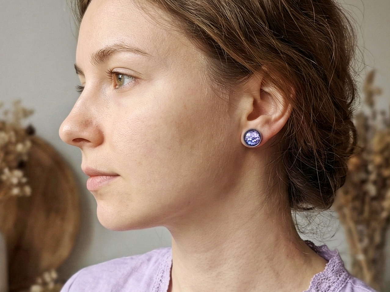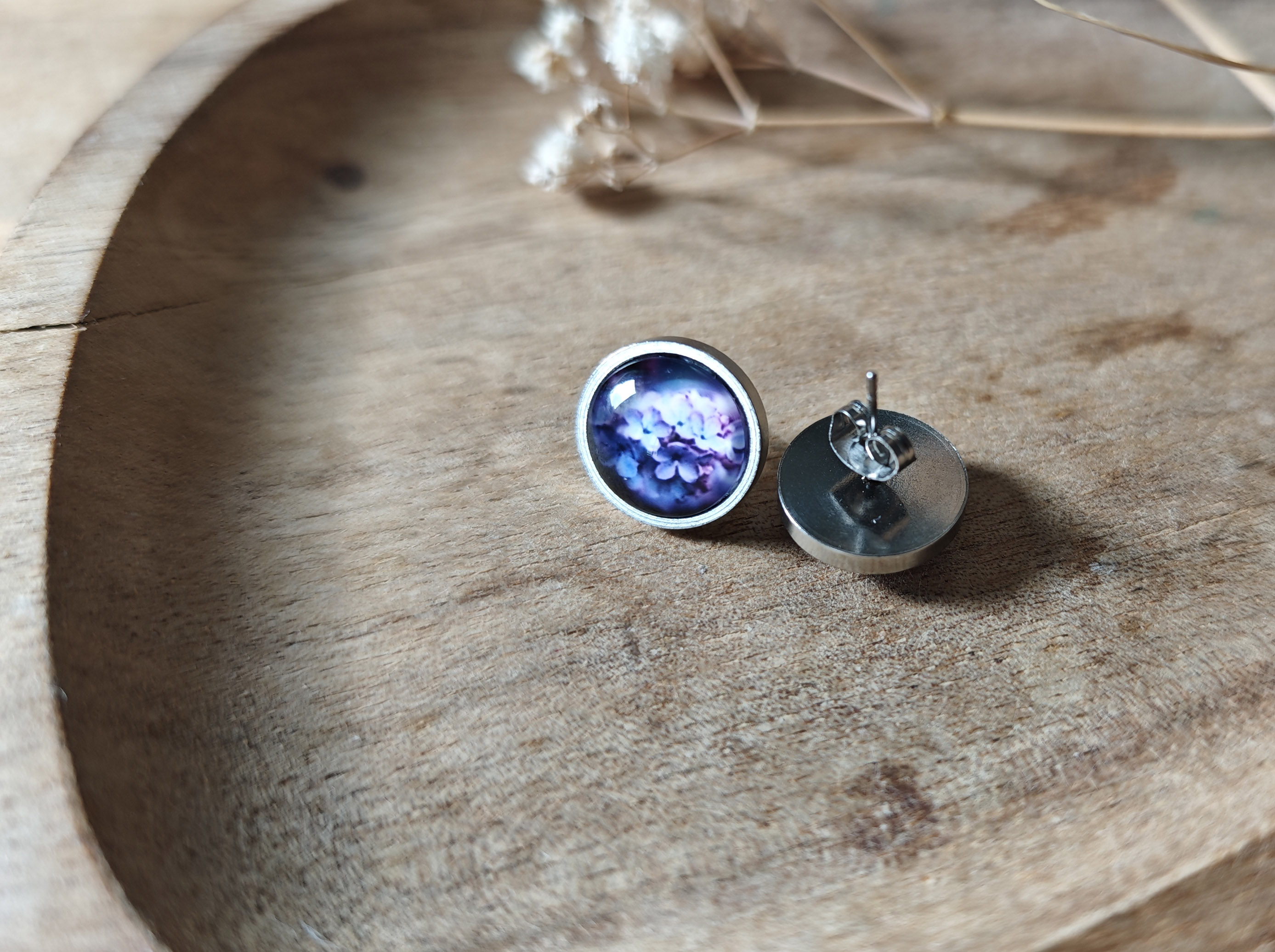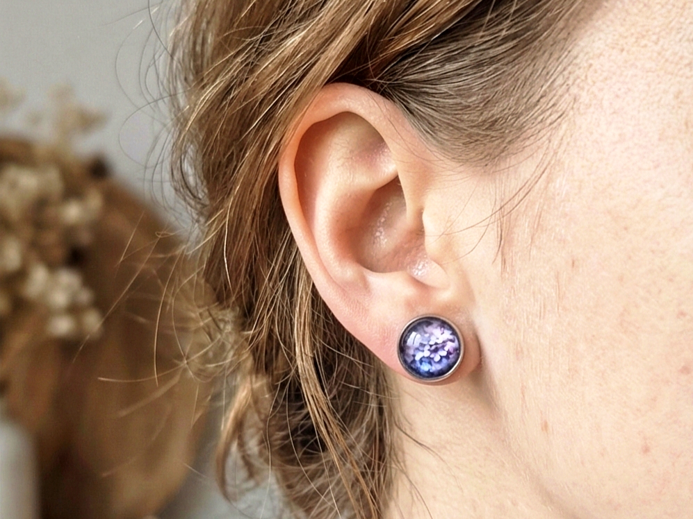 Небольшие очаровательные серьги с изображением цветущей сирени.Нержавеющая сталь, стекло. Заглушки силиконовые (также имеются и запасные).Размер изображения 12 мм. Украшение упаковано в подарочную коробочку и льняной мешочек.Рекомендации по уходу: беречь от падения. Избегать контакта с водой.