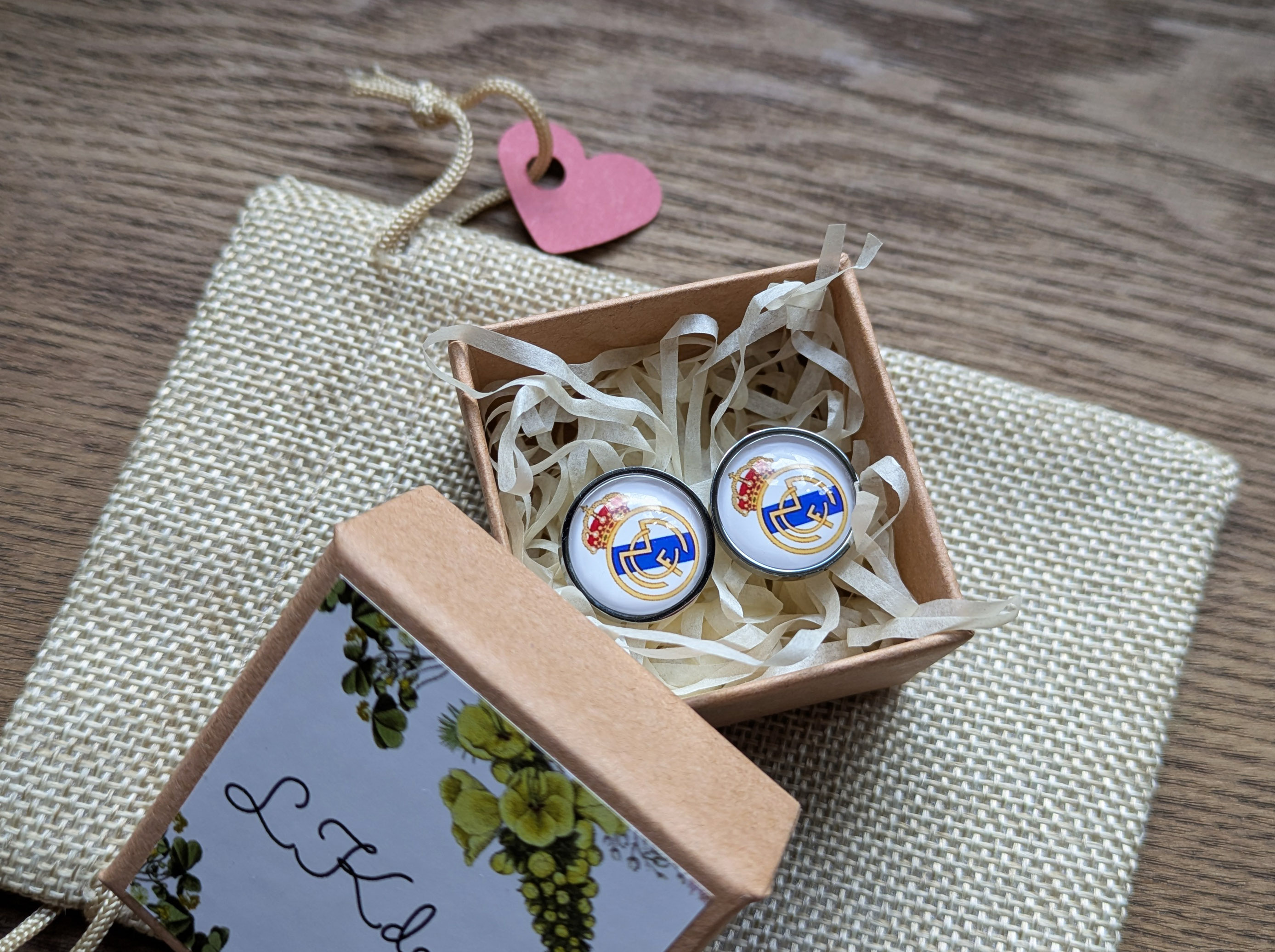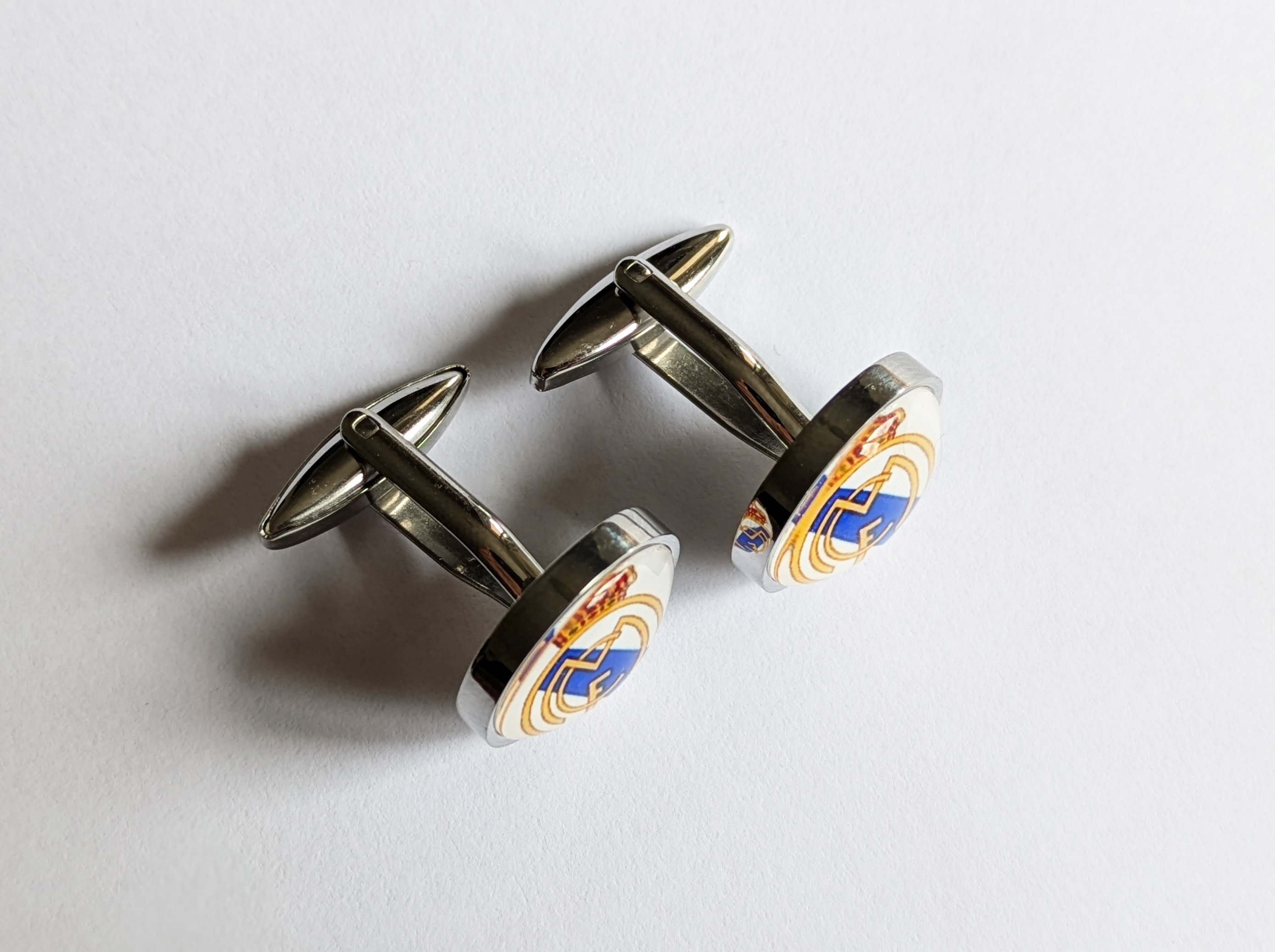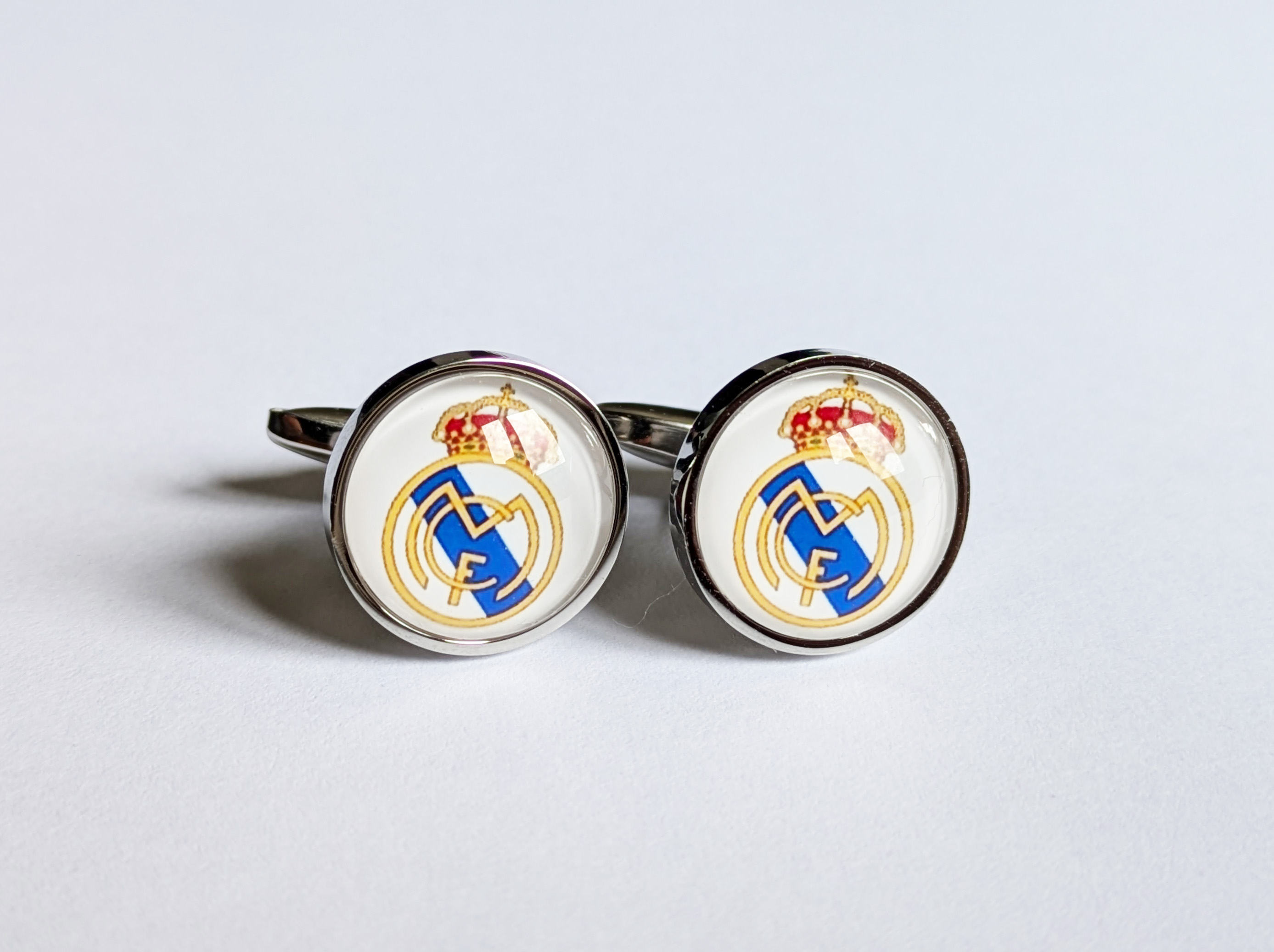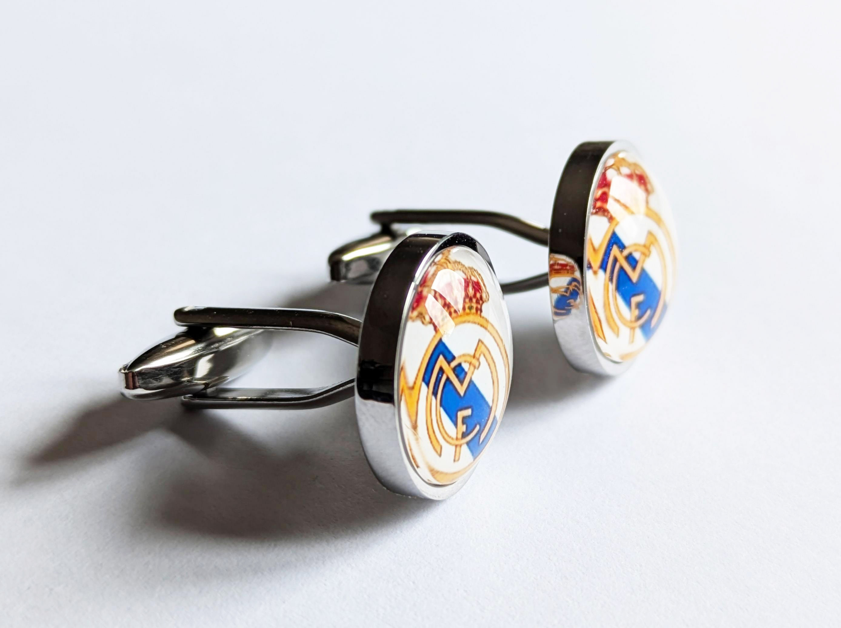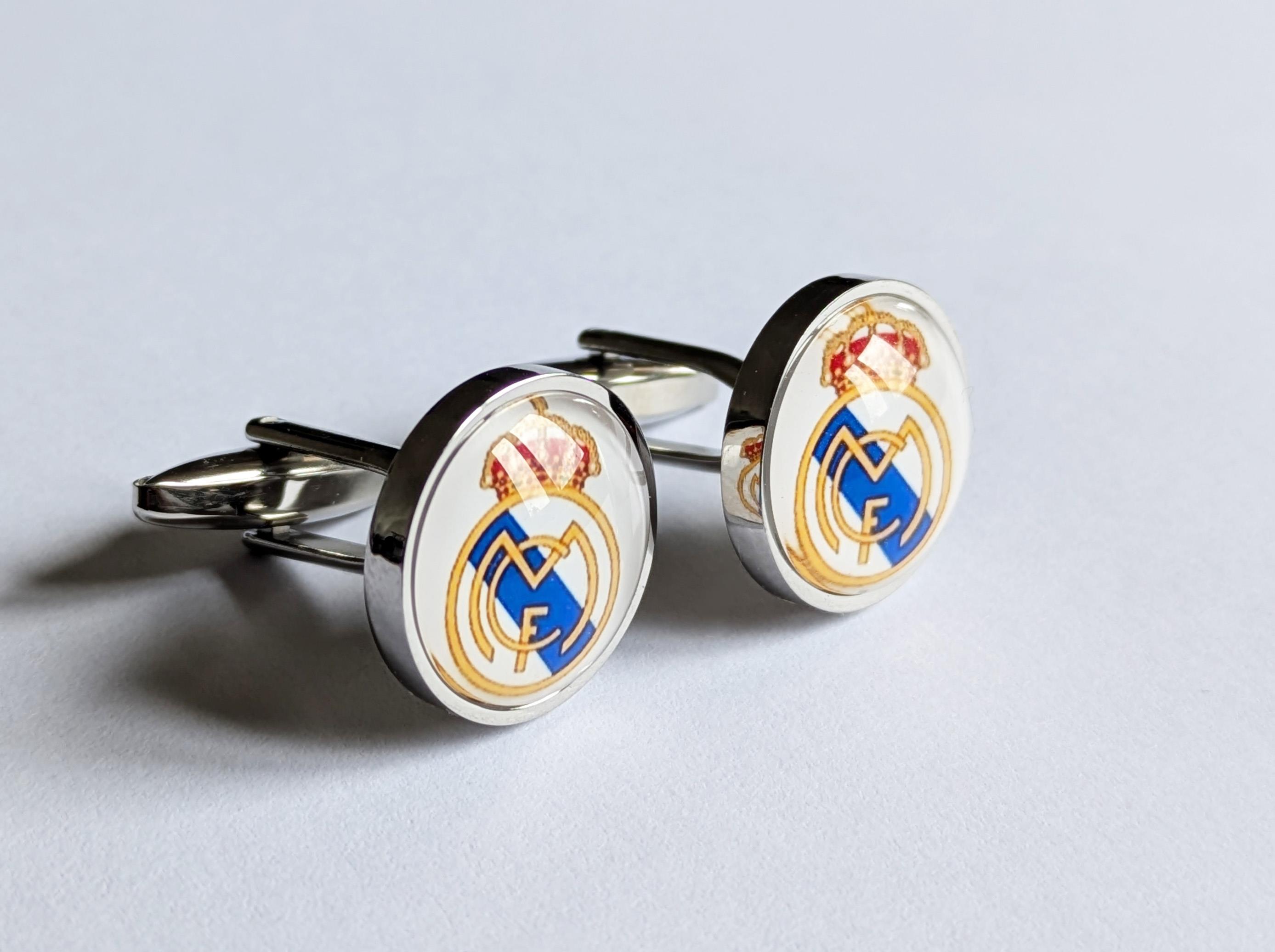 Крупные эффектные запонки с изображением футбольного клуба Реал Мадрид.Размер изображения 1,6 см.Нержавеющая сталь, стекло.Запонки упакованы в подарочную коробочку и льняной мешочек.